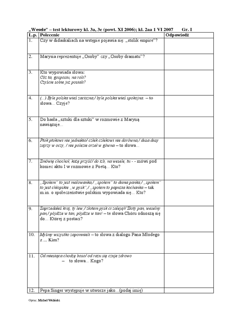 Pomoze Ktos Ze Sprawdzianem Z Wesele S Wyspianski Brainly Pl